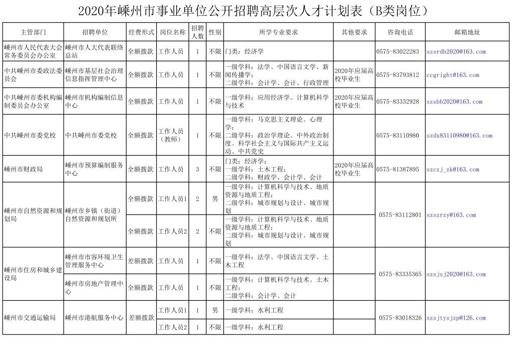 根据我市经济社会发展需要,计划公开招聘党政储备人才20名;高层次人才36名。具体的招聘单位、岗位、人数和应聘资格条件,详见《2020年嵊州市事业单位公开招聘党政储备人才计划表》(附件1)、《2020年嵊州市事业单位公开招聘高层次人才计划表》(附件2)。