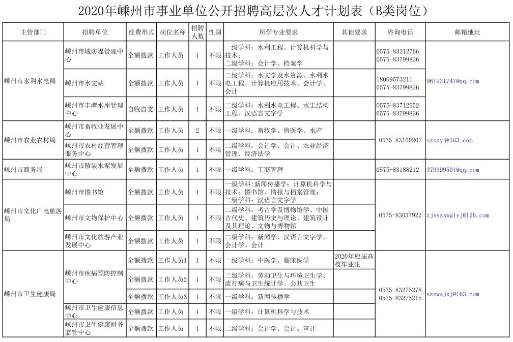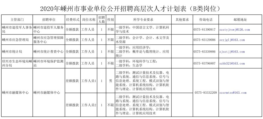 (七)对应聘岗位所需的专业、学历、其他资格条件等信息需要咨询时,请应聘人员直接与招聘单位联系。招聘单位的咨询电话及邮箱地址见《2020年嵊州市事业单位公开招聘党政储备人才计划表》、《2020年嵊州市事业单位公开招聘高层次人才计划表》。