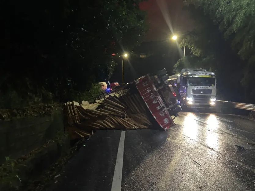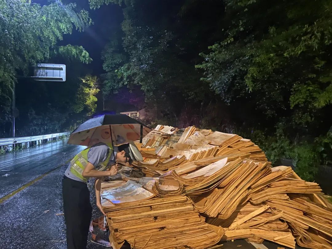 7月24日23时许,京福线桥墩蔡垟山路段处,一辆货车因刹车故障发生侧翻,车上货物散落一地,接到报警的桥墩交警中队迅速赶往现场,引导过往车辆通行,帮助货车驾驶员搬运货物,及时恢复道路交通秩序。