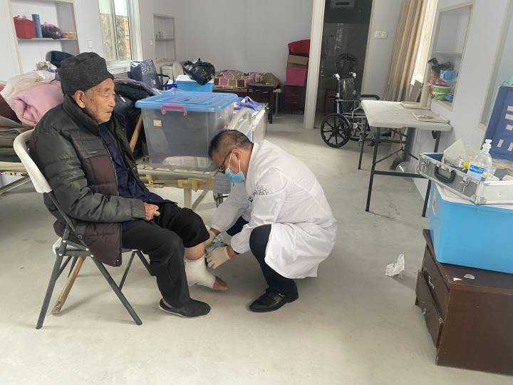郑庆国到敬老院为患者换药。