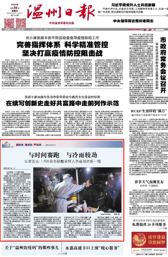 接到通报后,温州闻风而动。平阳以“一级响应”“战时状态”,第一时间启动应急响应预案,首批112名公安、卫健+疾控流调工作人员,鳌江镇封控区、管控区、防范区内40多名乡镇干部全部进岗到位,1300名核酸采样人员迅速集结,并启动临时采样点131个。
