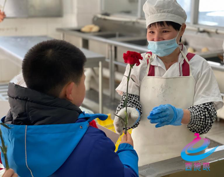 诸暨市浣东小学的孩子们,将贺卡和鲜花献给食堂阿姨和保洁阿姨们。孩子们用小小的举动,致敬那些在平凡岗位上默默耕耘的女性们。(通讯员 夏丹)