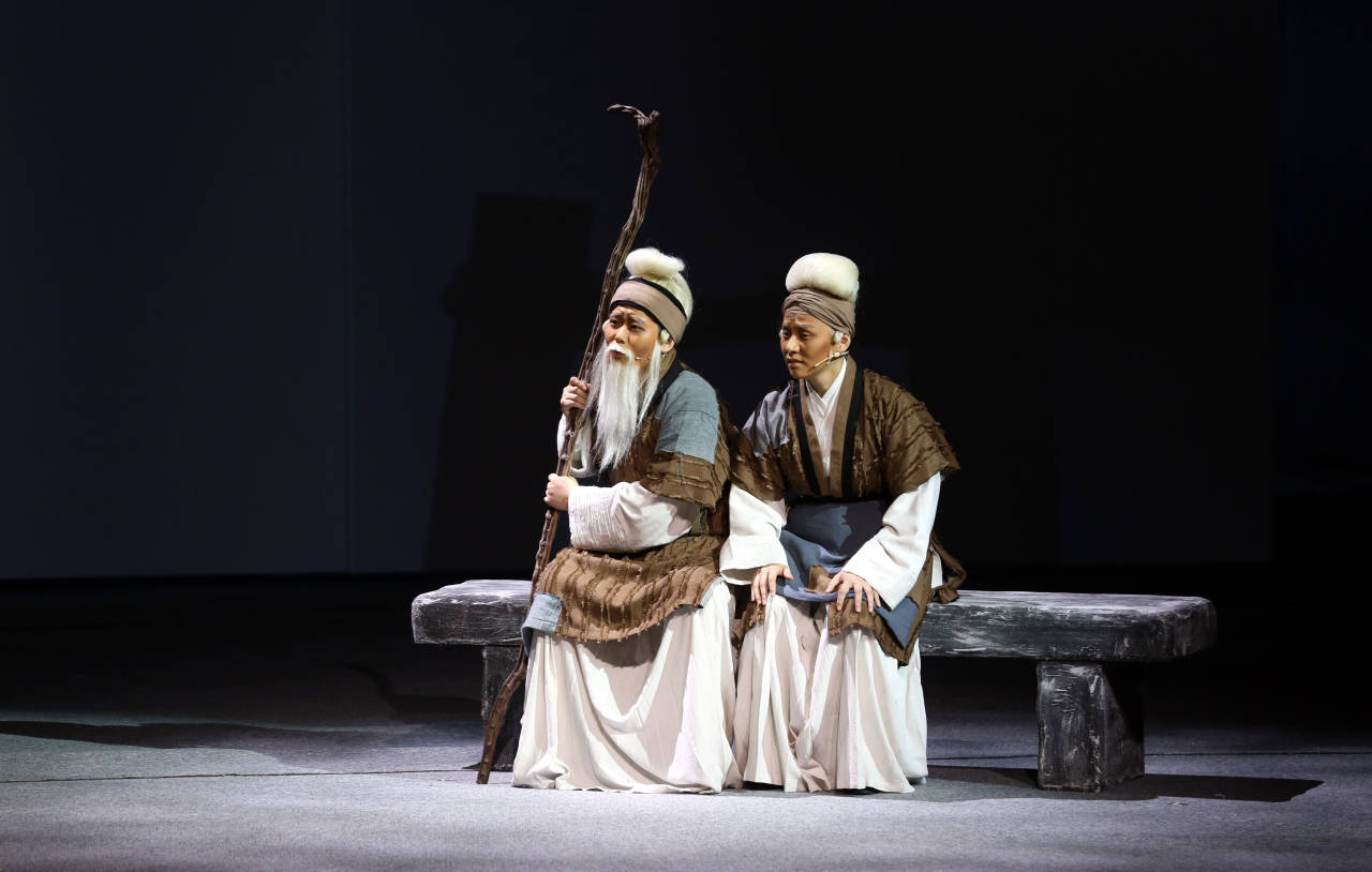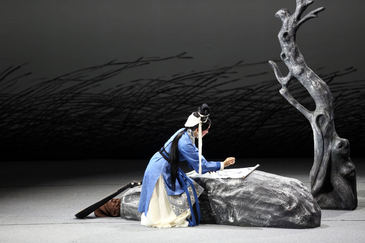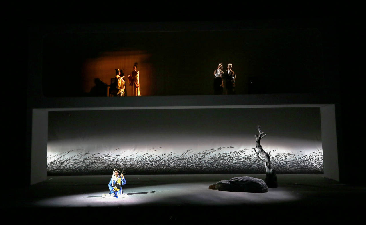 瑞越版《琵琶记》在表演形式上虽然没有采用高明原著中的“副末出场”,也没有采用传统戏曲舞台上的一桌二椅,但是在舞美上独具匠心地运用双层式架构。它上层是表现剧作家高明创作《琵琶记》和温州鼓词艺人演唱《琵琶记》的情景,它巧妙地解决了如何将二者融入剧情又不割裂剧情的难题,这也为瑞越版《琵琶记》打上鲜明的地域文化特色。