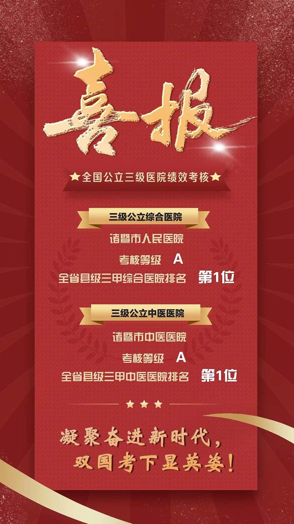 据了解,全国公立医院绩效考核是国家深化医改,推进健康诸暨高质量发展的一项重要举措。考核指标体系由医疗质量、运营效率、持续发展、满意度评价4个方面的指标构成,是公认的评估公立医院综合实力的“金标准”,有三级公立医院绩效“国考”之称。
