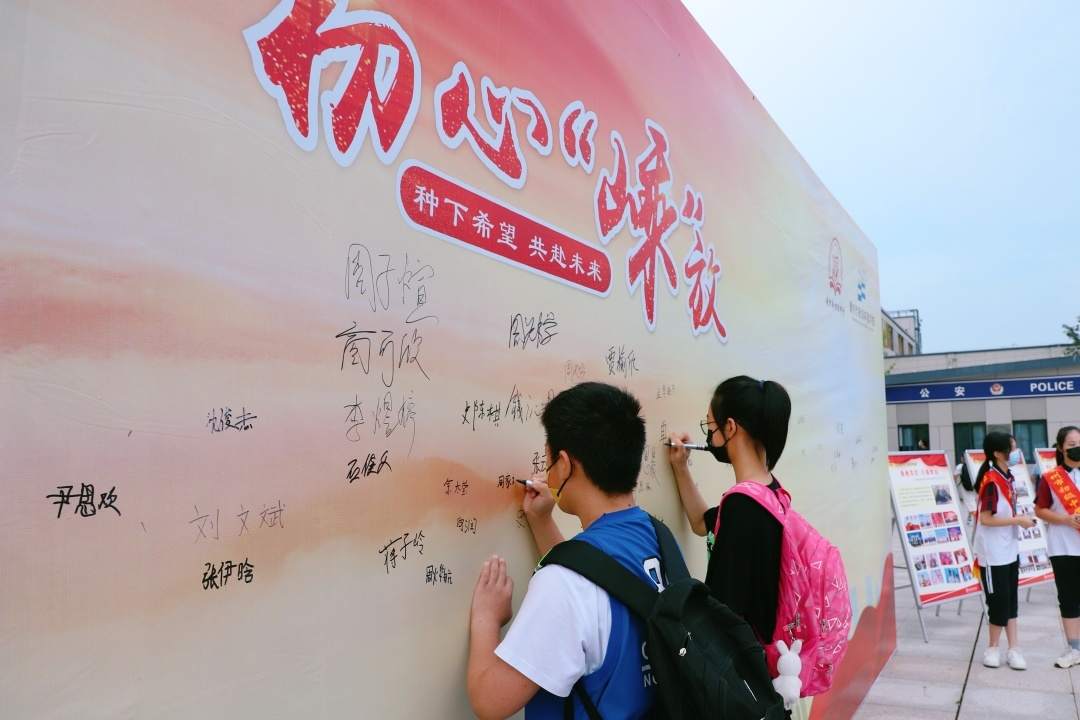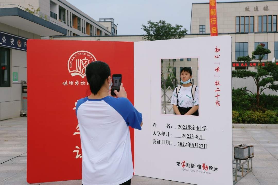 在嵊州市初级中学校门广场,孩子们在迎新签名墙签下自己的大名,体验了一把当明星的感觉!这是你们与嵊初签下的第一个约定,许下初心,种下希望,让我们共赴美好的未来!