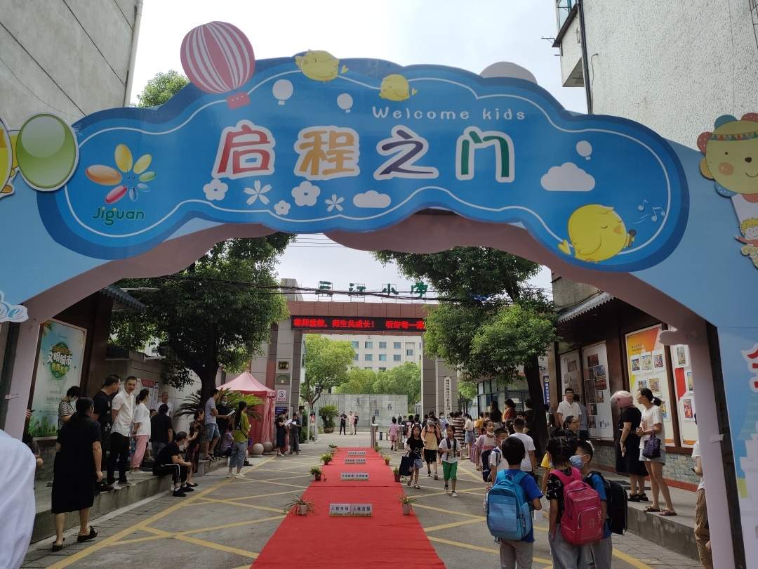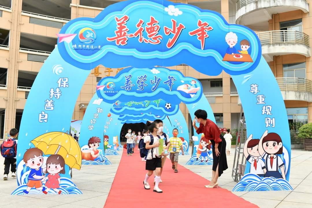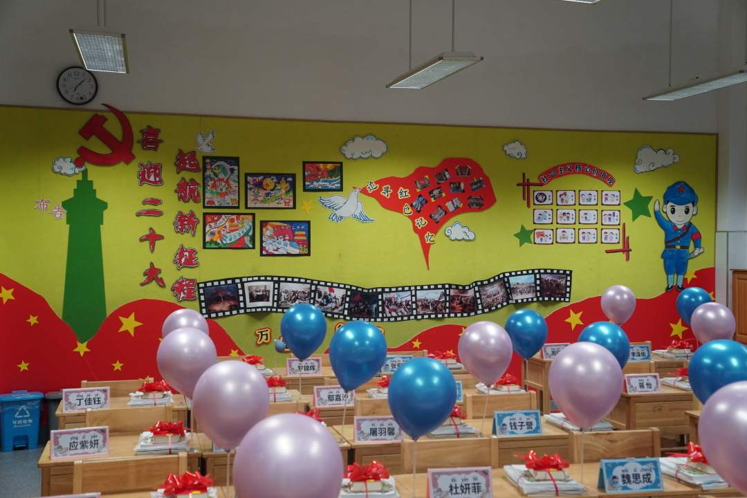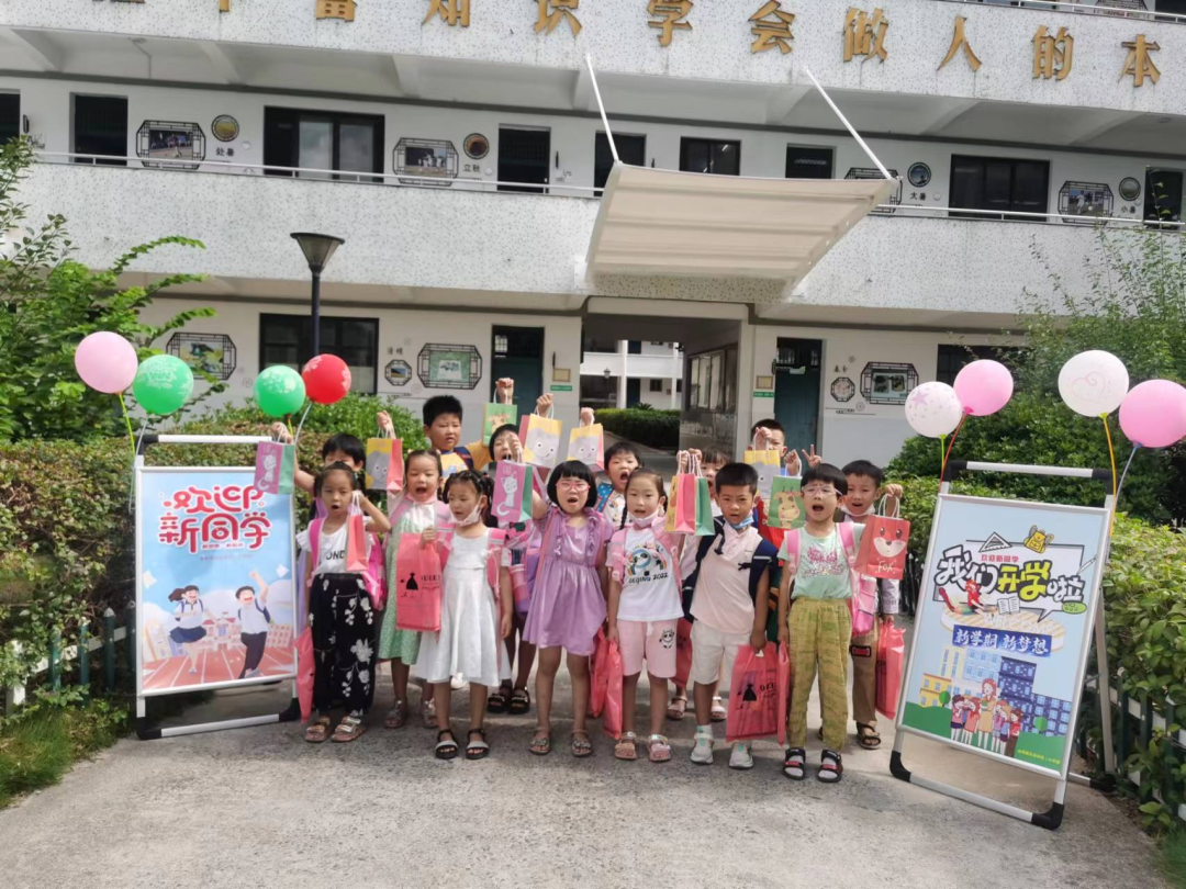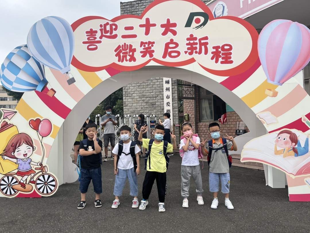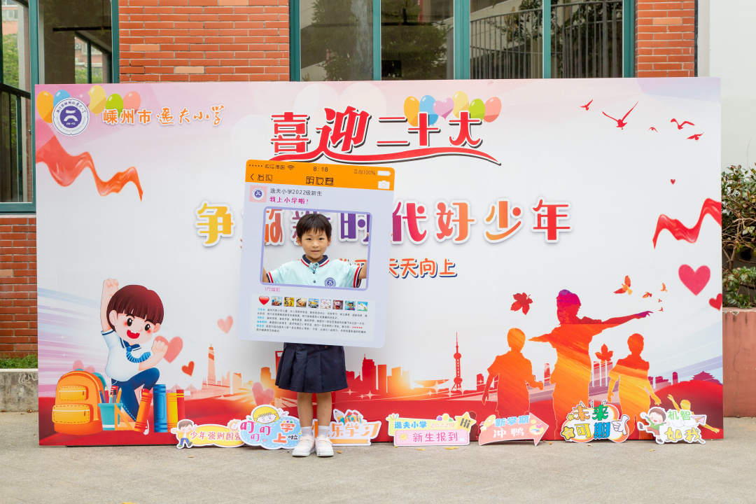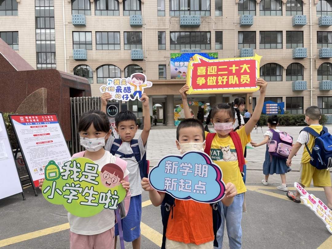 剡溪小学开展了以“喜迎二十大 争做好少年”为主题的开学礼活动。一年级的小朋友在校门口领取水精灵姓名章,过红地毯师生问好,穿过“五好少年”拱门,主题墙签名、合影,最后由礼仪队员带到各班领取新书。
