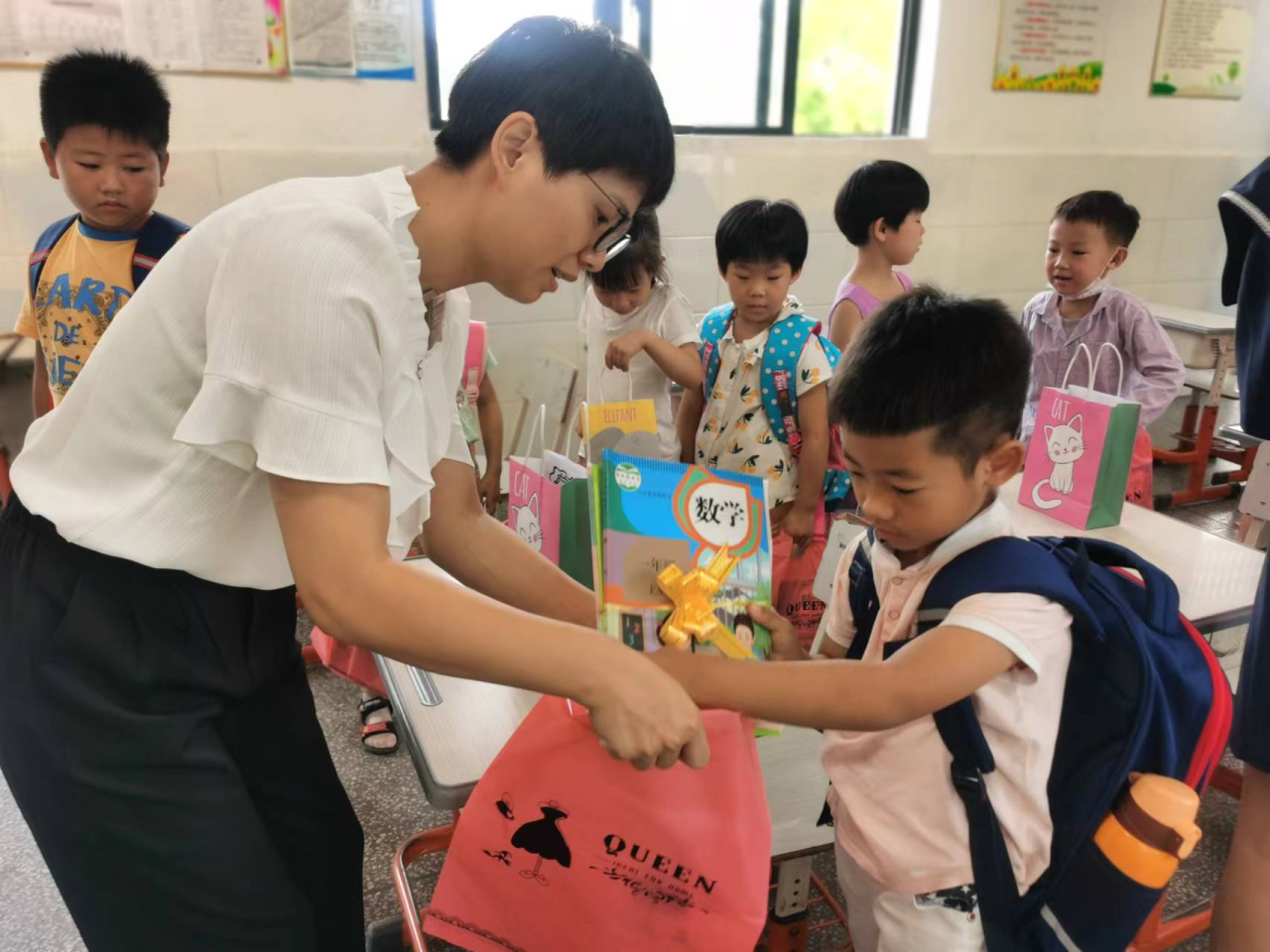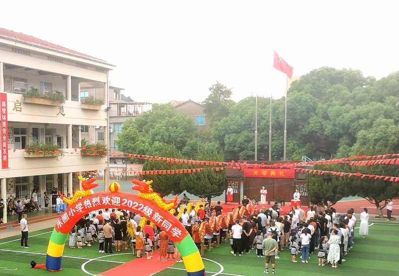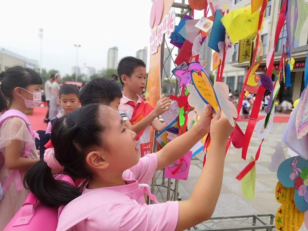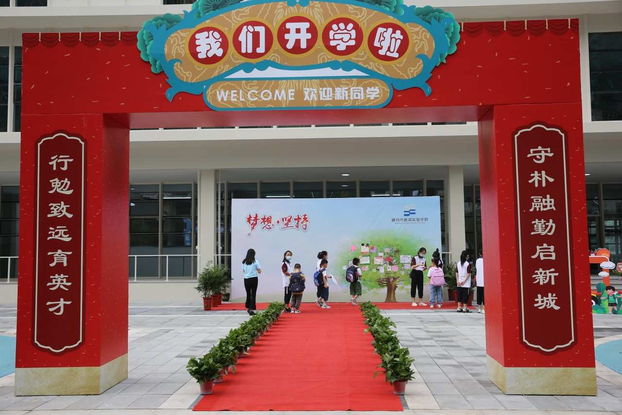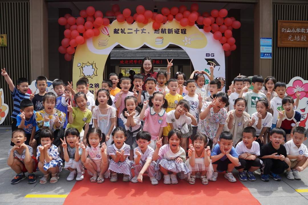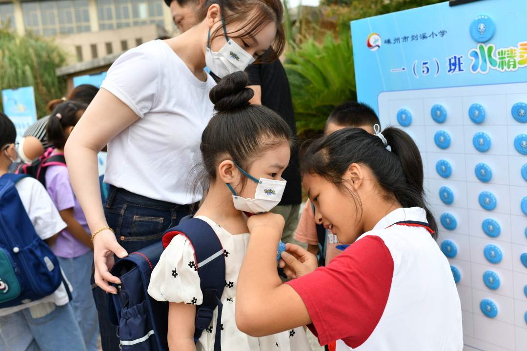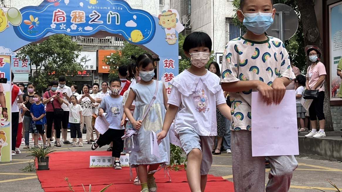 剡溪小学开展了以“喜迎二十大 争做好少年”为主题的开学礼活动。一年级的小朋友在校门口领取水精灵姓名章,过红地毯师生问好,穿过“五好少年”拱门,主题墙签名、合影,最后由礼仪队员带到各班领取新书。