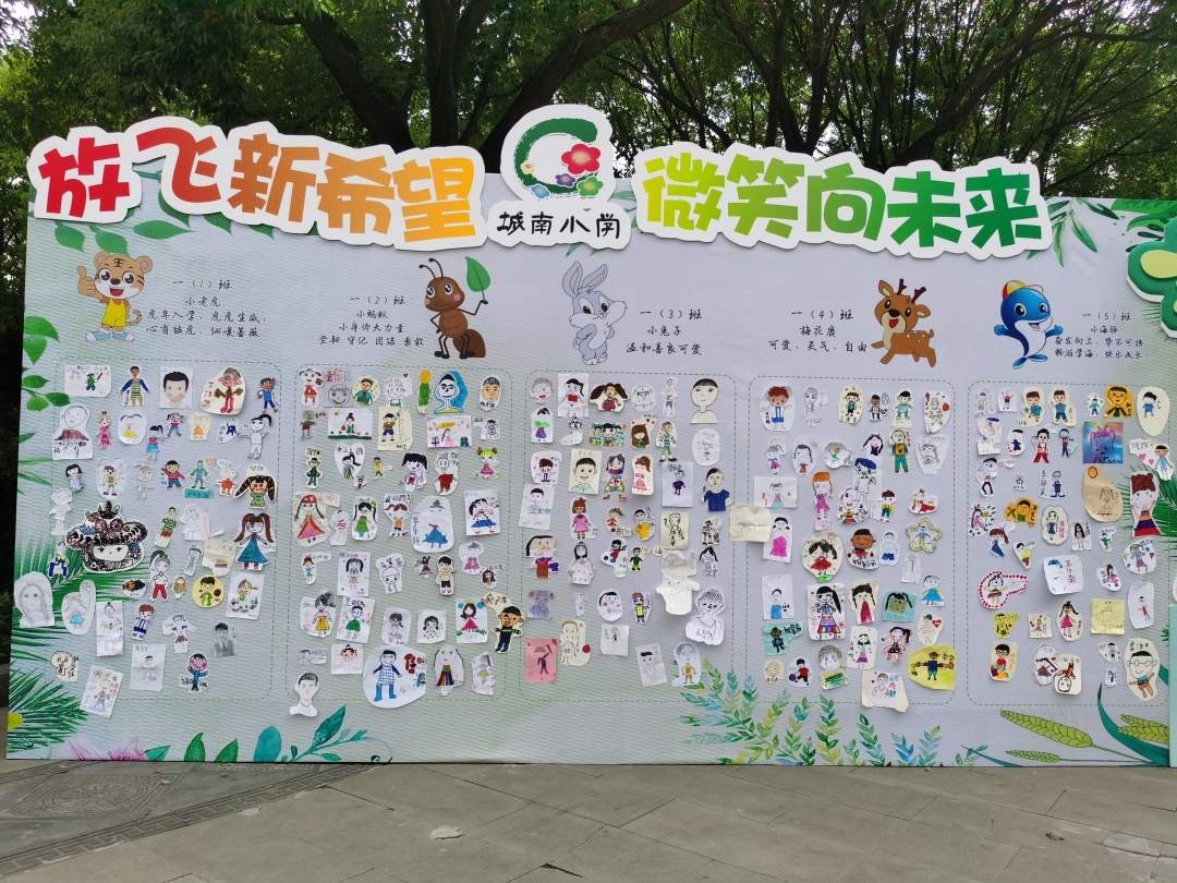 城南小学的大屏幕滚动播放着全体新生的笑脸照,一年级孩子们还在主题墙上贴上了自画像,期待着在新的校园“放飞新希望,微笑向未来”。