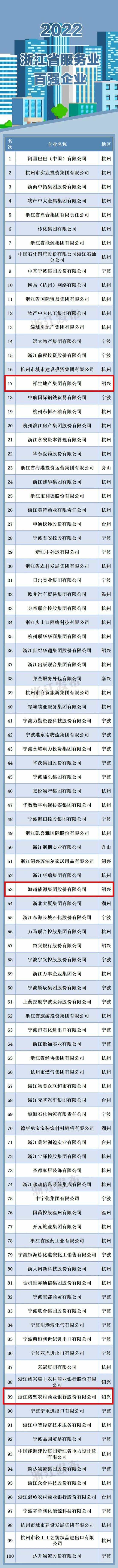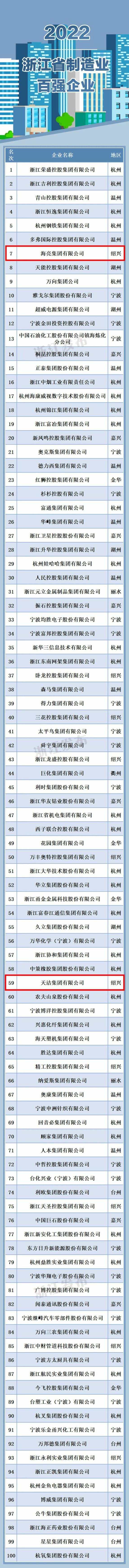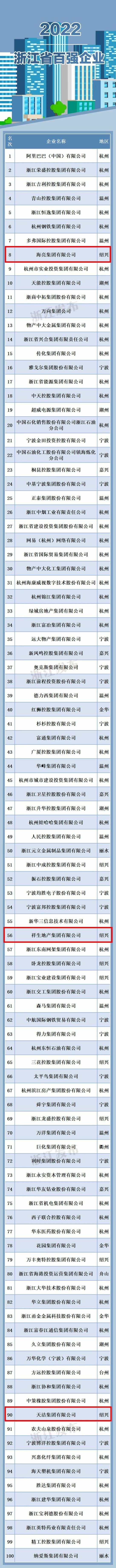 近日,浙江省企业联合会、省企业家协会、省工业经济联合会正式发布了《2022浙江省百强企业》榜单,其中包括《2022浙江省综合百强企业》《2022浙江省制造业百强企业》《2022浙江省服务业百强企业》《2022浙江省成长性最快百强企业》。