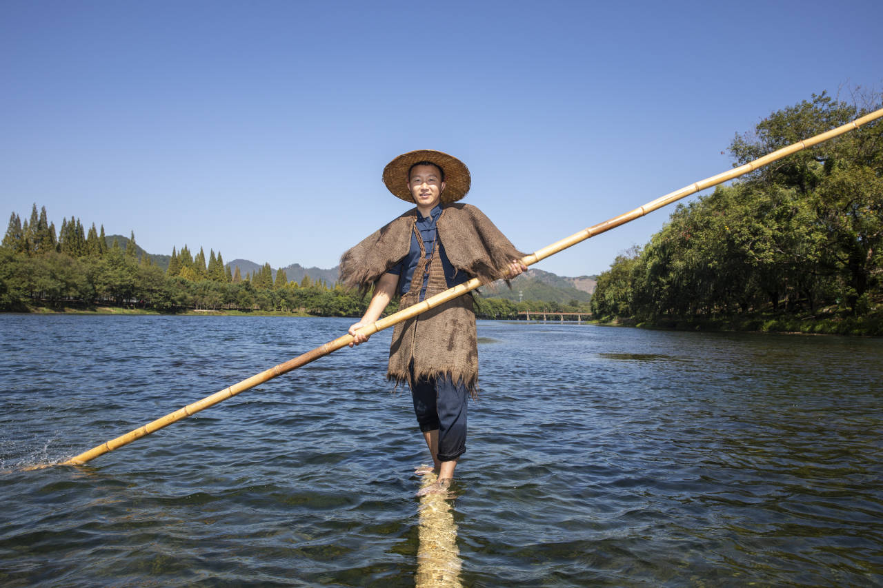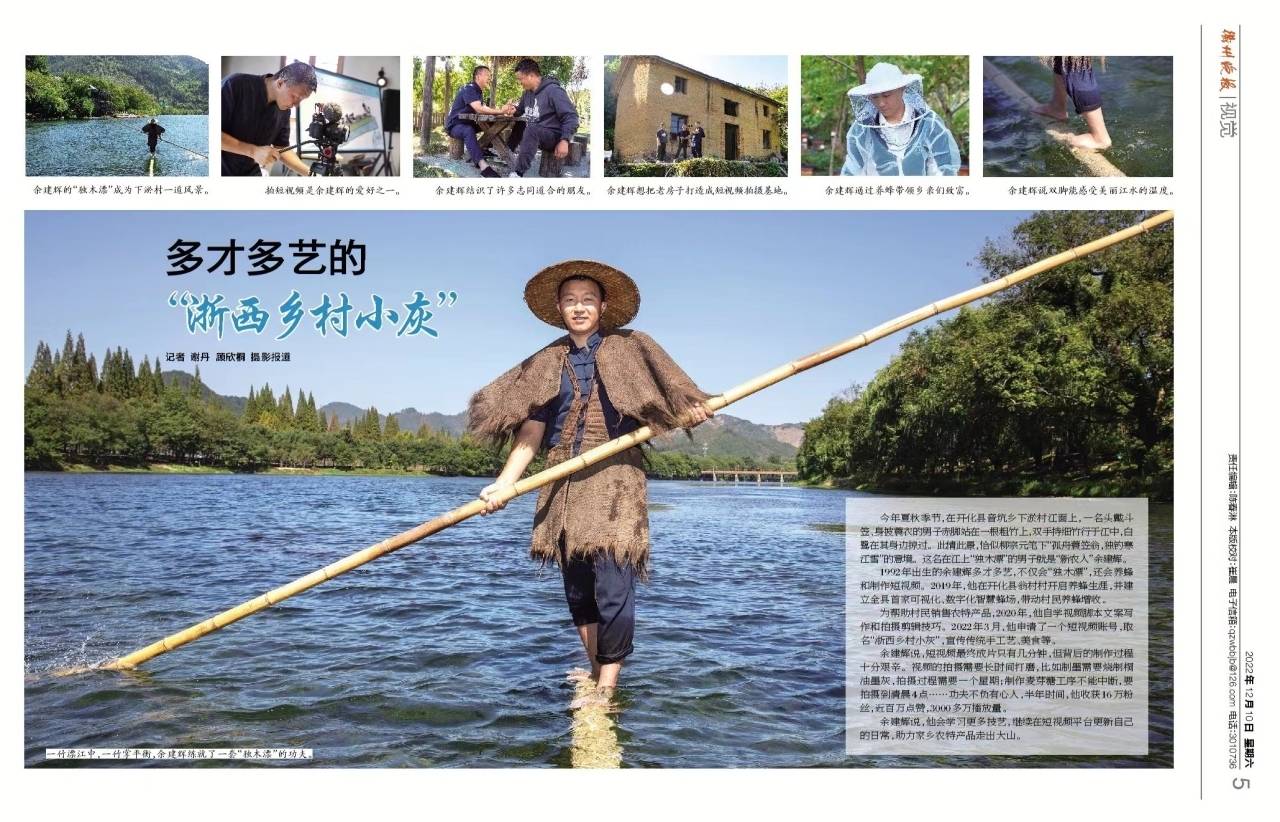 余建辉,1992年生,在开化县音坑乡下淤村,经常看到他在江面上表演“独木漂”。余建辉多才多艺,他还是一位养蜂人和短视频博主,2019年建立了开化县首家“数字化智慧蜂场”,不仅自己做起了老板,也带动了其他村民养蜂增收。2022年3月,余建辉根据自己的特长量身定制了一个短视频账号,取名“浙西乡村小灰”,短短半年就收获了全网16万粉丝,近百万的点赞,3000多万的播放量的成绩,把家乡的传统手工艺和美食宣传了出去。