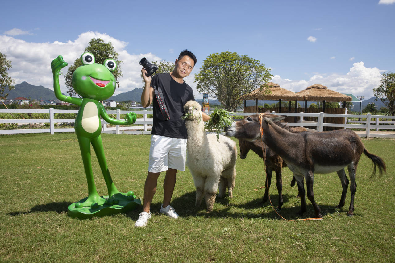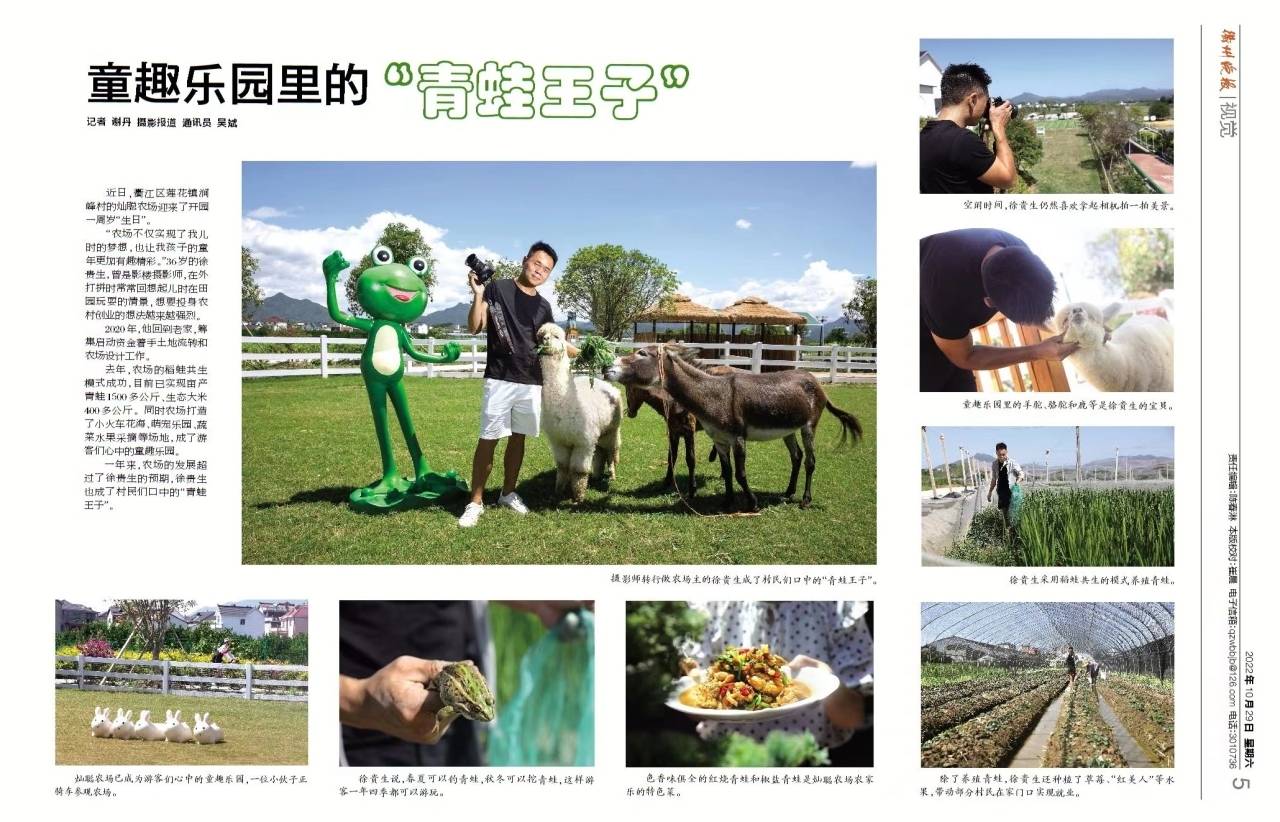 徐贵生,1986年生,在衢江区莲花镇涧峰村,他建设的以青蛙为主题的农场自2021年国庆开园后便一炮打响。徐贵生曾经做过影楼摄影师,也做过园林绿化,在外打拼时他常常想起儿时抓青蛙的记忆,想要投身农田自己创业的想法越来越强烈,2020年,他将自己的房子作抵押,筹集到启动资金后就开始他的田园梦。开园一年来,农场的发展已超过了他的预期,他想通过这一波热度把自己的青蛙品牌推广出去,创出餐饮+游玩的线性连贯发展新模式,带动更多的人和他一起创业致富。
