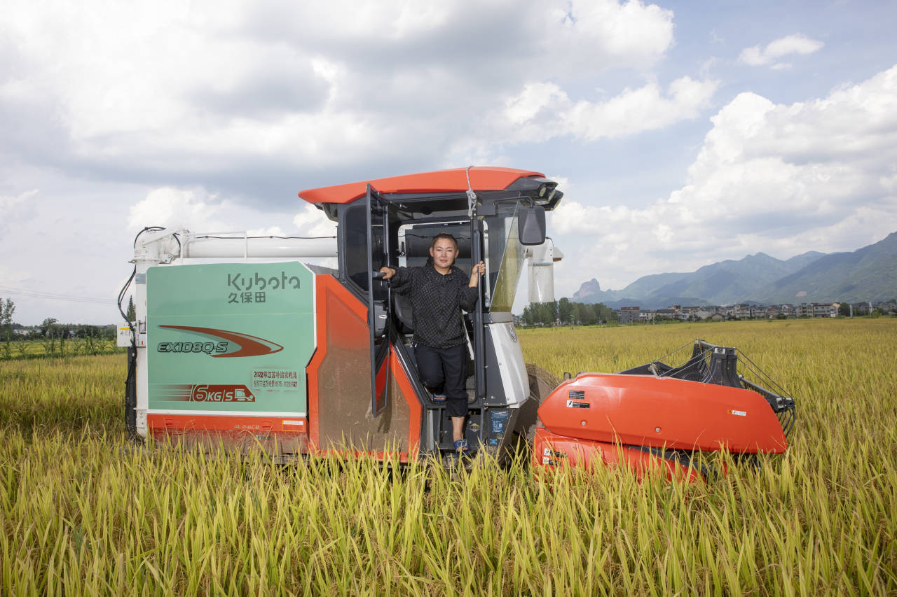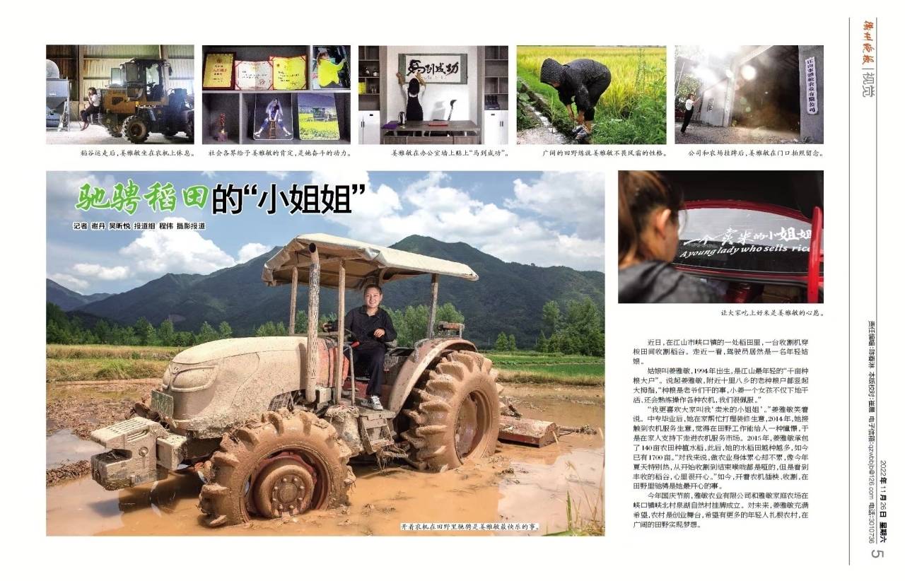 姜雅敏,1994年生,她是江山市最年轻的种粮大户,也是一位女汉子,她开着农机在稻田里的样子让很多人过目不忘。2015年,姜雅敏在峡口镇承包了140亩农田种植水稻,试种成功后,她扩大承包面积,从140亩到如今的1700亩。开着农机打田、插秧、收割,在田野里驰骋成为她最开心的事。今年国庆节前,姜雅敏的雅敏家庭农场和雅敏农业有限公司挂牌,随着更多机械的进场,她有了更远的计划。她说,农民是一份职业,农村是广阔的创业舞台,希望有更多的年轻人扎根农村,脚踩泥土,在田野里实现梦想。