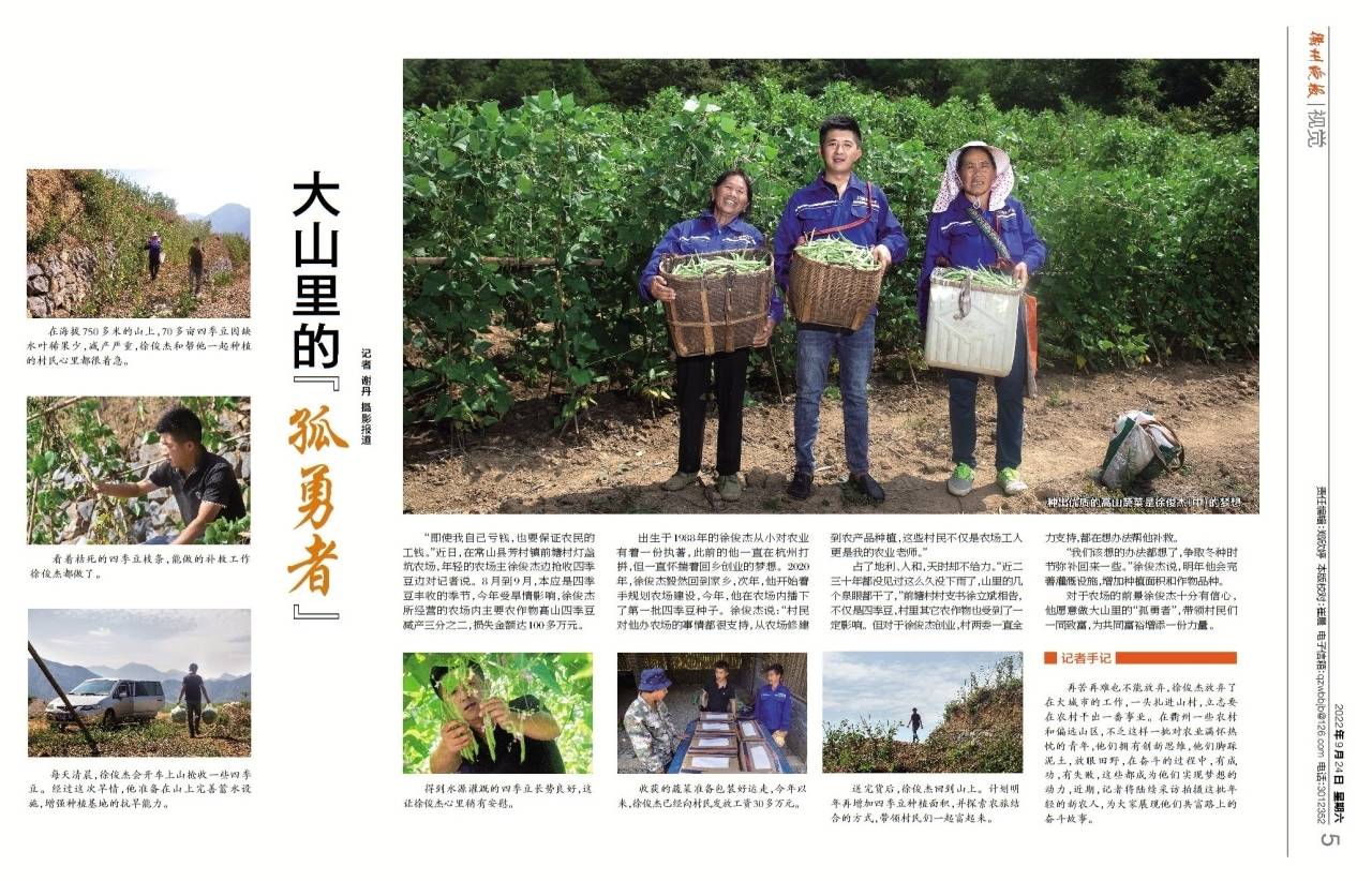 徐俊杰,1988年生,在常山县芳村镇前塘村,徐俊杰经营者一座高山蔬菜农场,今年由于干旱,农场内的主要农作物高山四季豆减产三分之二,损失至少100多万,但他仍然按时发放了农民们的工钱。徐俊杰曾在杭州打拼,修过电脑开过网吧,然而他的心里总有一份回乡创业的想法。2020年他回村着手土地流转,2021年开始农场建设,他说当地的村民对他都很支持,这些村民不仅是农场工人更是他的老师,他回馈给村民的就是给他们更优的待遇,带动更多的村民增收。“今年虽然天不如人愿,但我依然会坚持下去,明年再努力。”