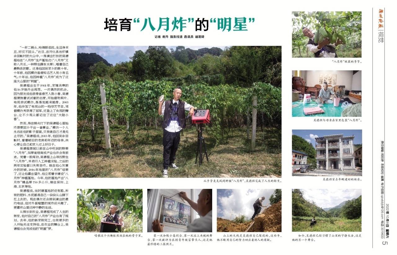 吴德程,1981年生,开化县池淮镇余田畈村人。家境贫寒的他16岁就出门闯荡,因长相酷似一位香港明星,历经一些模仿选秀节目后,在镁光灯的舞台上,他成为了一位草根明星,但是他心里始终想回乡干出一番事业。2013年,他回到家乡,放弃了所有表演邀约,一头钻进山林,用3年的时间试种并建成了“八月炸”种植基地,并成功销往深圳、上海、北京等地。从娱乐到农业,吴德程完成了人生的转变,在农业的舞台上,他也会完成自己的“明星”梦。