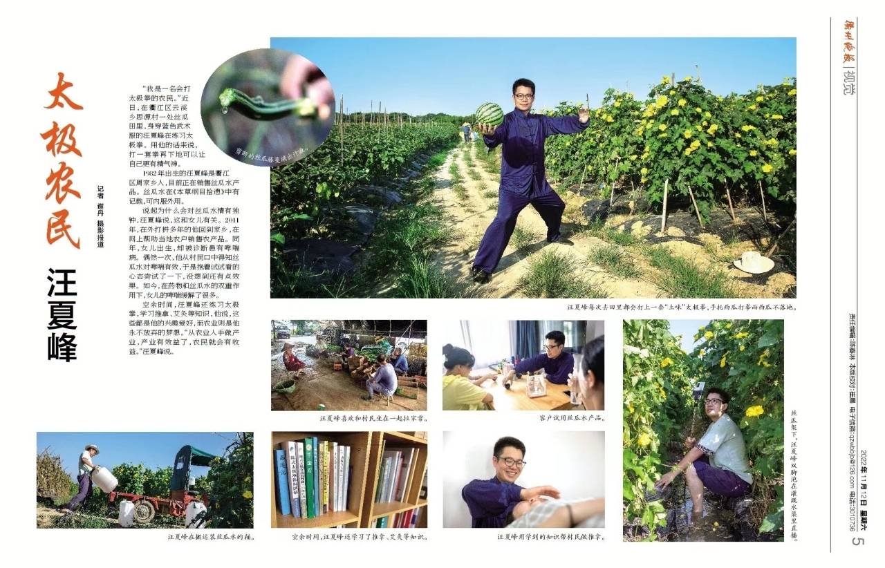 汪夏峰,1982年生,他经营着一种少见的农副产品——丝瓜水,据他介绍,丝瓜水又名天罗水,在《本草纲目拾遗》中记载,天罗水可内服外用,内服有有清热解毒,止咳化痰的功效,外用有良好的养颜作用。除丝瓜水外,他还学习太极拳、推拿、艾灸和中医知识,他说,这些都是他的兴趣爱好,而农业则是他不会抛弃的梦想。“要想让农民富起来就要做农民懂的东西,农业是农民最懂的事情,所以就要从农业入手做产业,产业有效益了,农民就会有收益。”汪夏峰说。