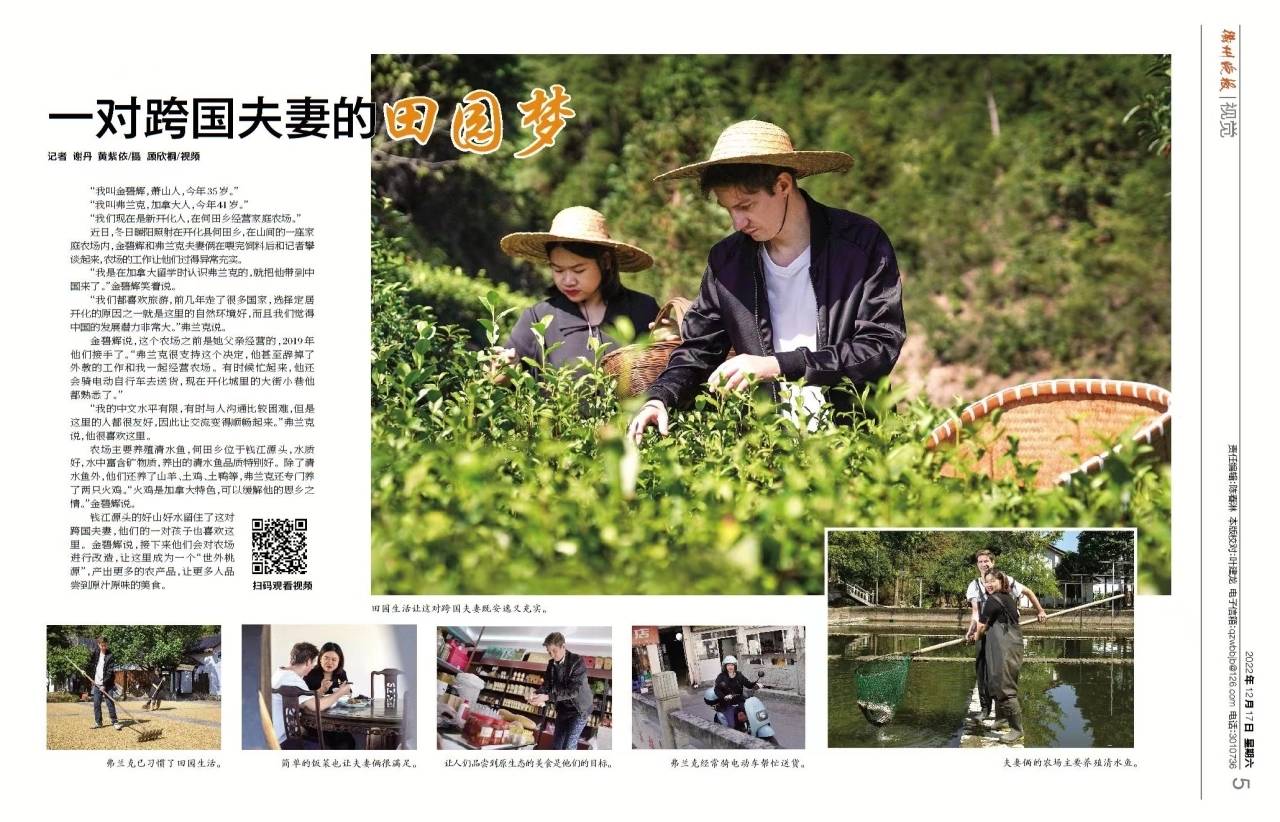 弗兰克,加拿大人,1981年生。2016年,弗兰克随妻子金碧辉来到开化县定居,在何田乡与妻子经营着一座清水鱼农场。弗兰克说,他喜欢中国的原因之一就是这里的自然环境非常好,发展潜力非常大,他们的农场位于钱江源头,这里的水质养出的清水鱼很畅销,他和妻子一起努力把这座农场逐渐改造成“世外桃源”,希望吸引上海、杭州等大城市的游客到这里旅游,让更多的优质农产品走出山外。