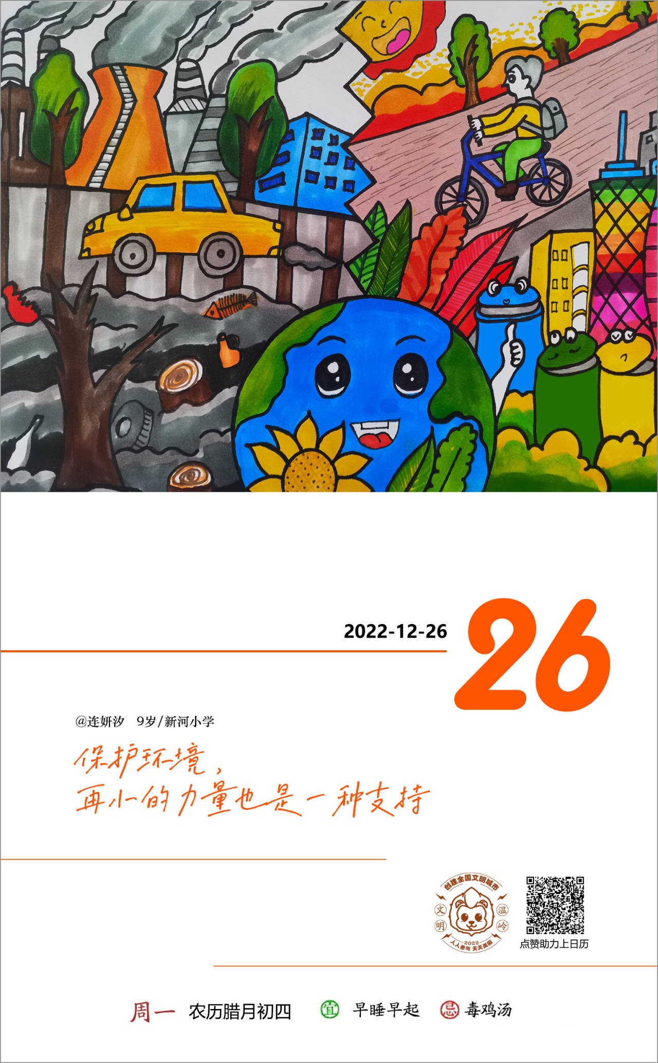 人人共建,天天美丽。【文明日历】向您征集绘画、书法作品。奖励办法:学生组30元/张,周点赞过400,双倍奖励。另征集每日文明城市创建励志小短句,录用奖励10元/条。