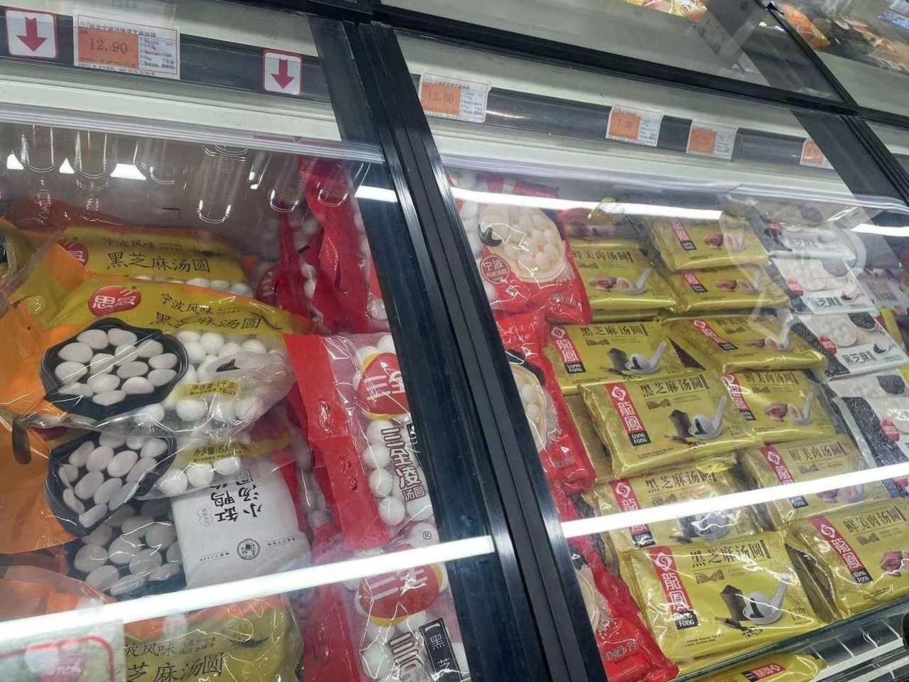 冰柜里陈列的各品牌黑芝麻汤圆