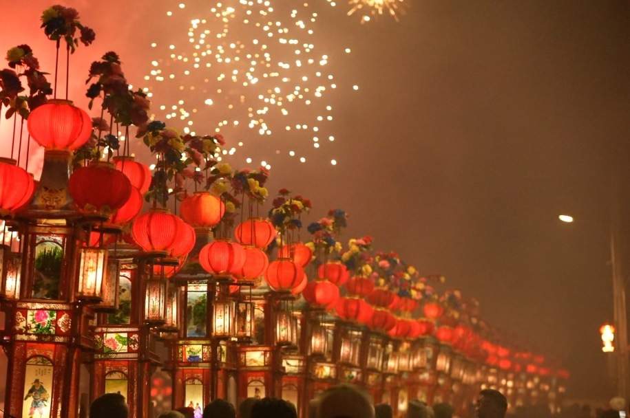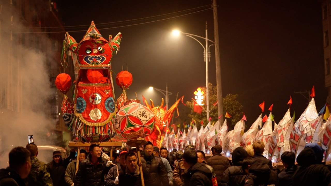 夜幕降临,红灯高挂、锣鼓欢腾,一条长达300多米的“亭阁花灯”在龙珠的引领下,缓慢起龙,游走在宋代古茶场和村道之间。从空中俯瞰,颇有“火树银花合,星桥铁锁开”的意象,流光溢彩,别样迷人。