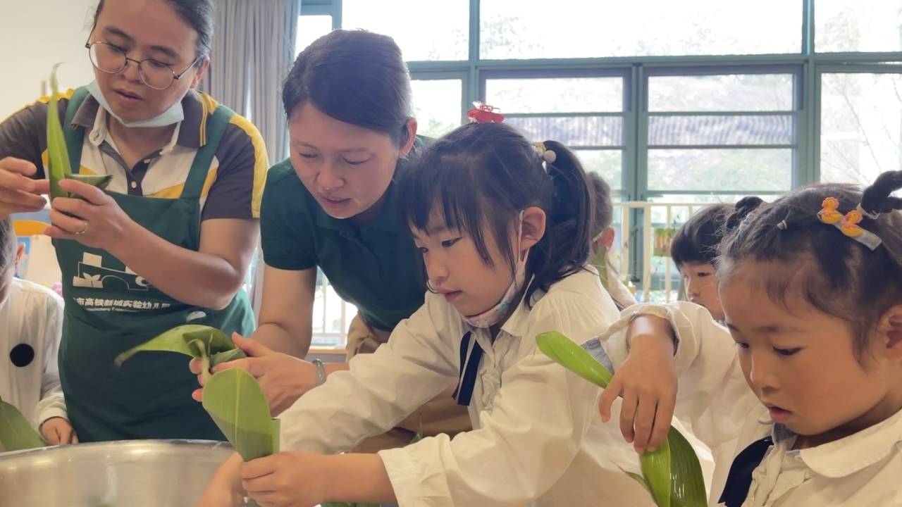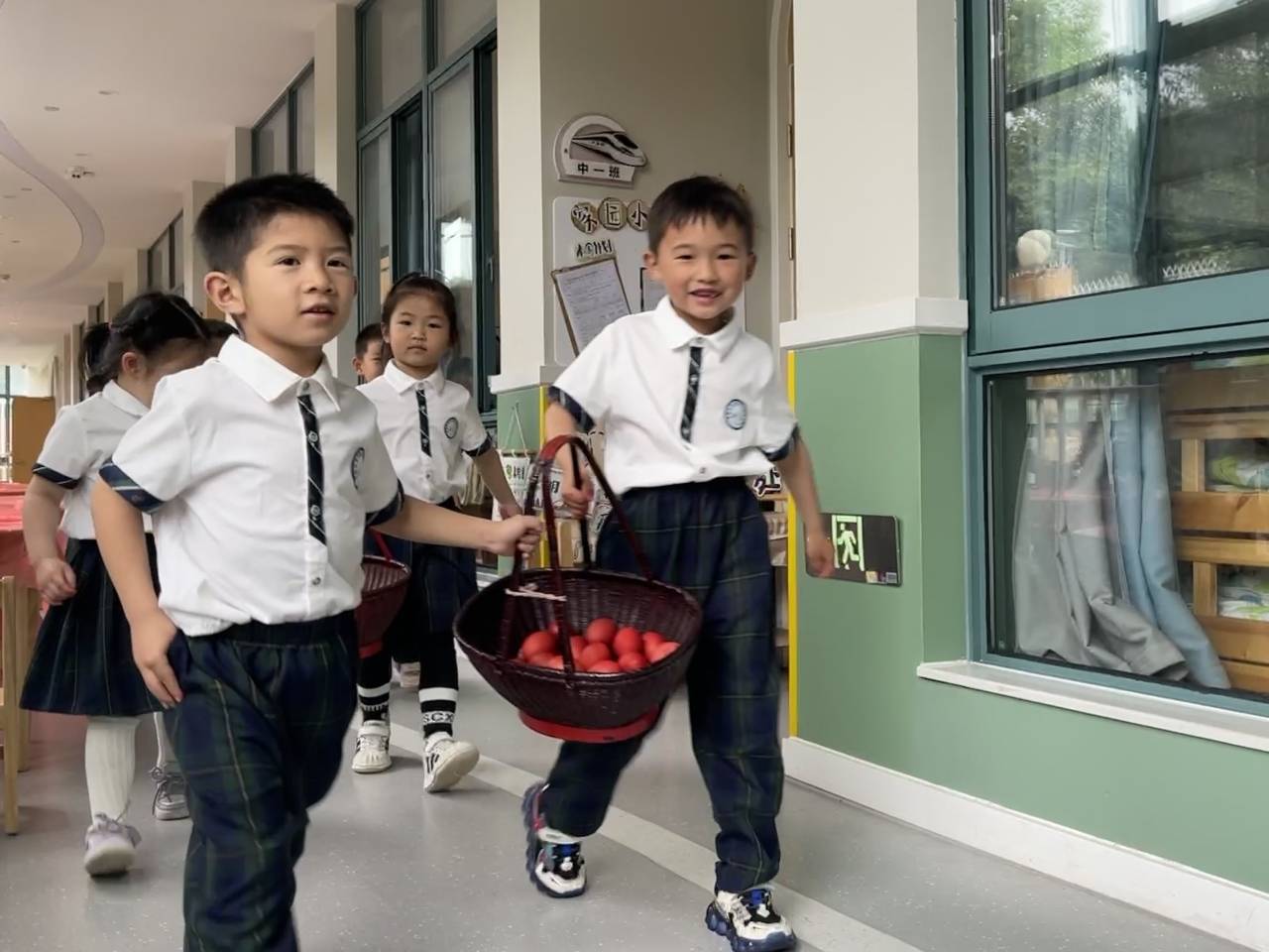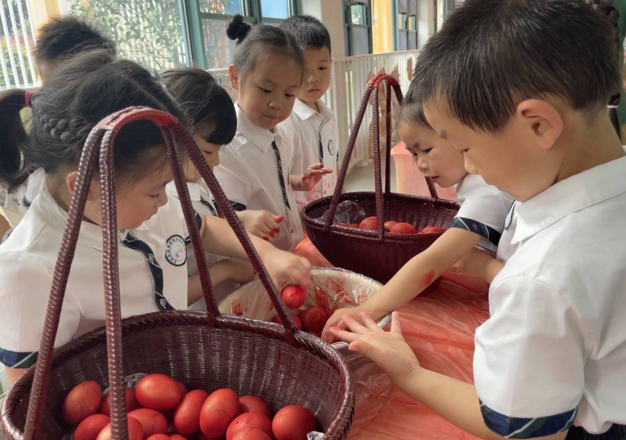 粽子、杨梅馃、“喜”字馒头和红蛋,是东阳传统宴席上不可或缺的美食。为此,大一班的孩子们裹起了粽子,大二班的孩子们“滚”起了杨梅馃,大三班的孩子们揉起了“喜”字馒头,中班的孩子们则两人一组拎起了喜篮,游走在整个幼儿园里,为大家分发红蛋。