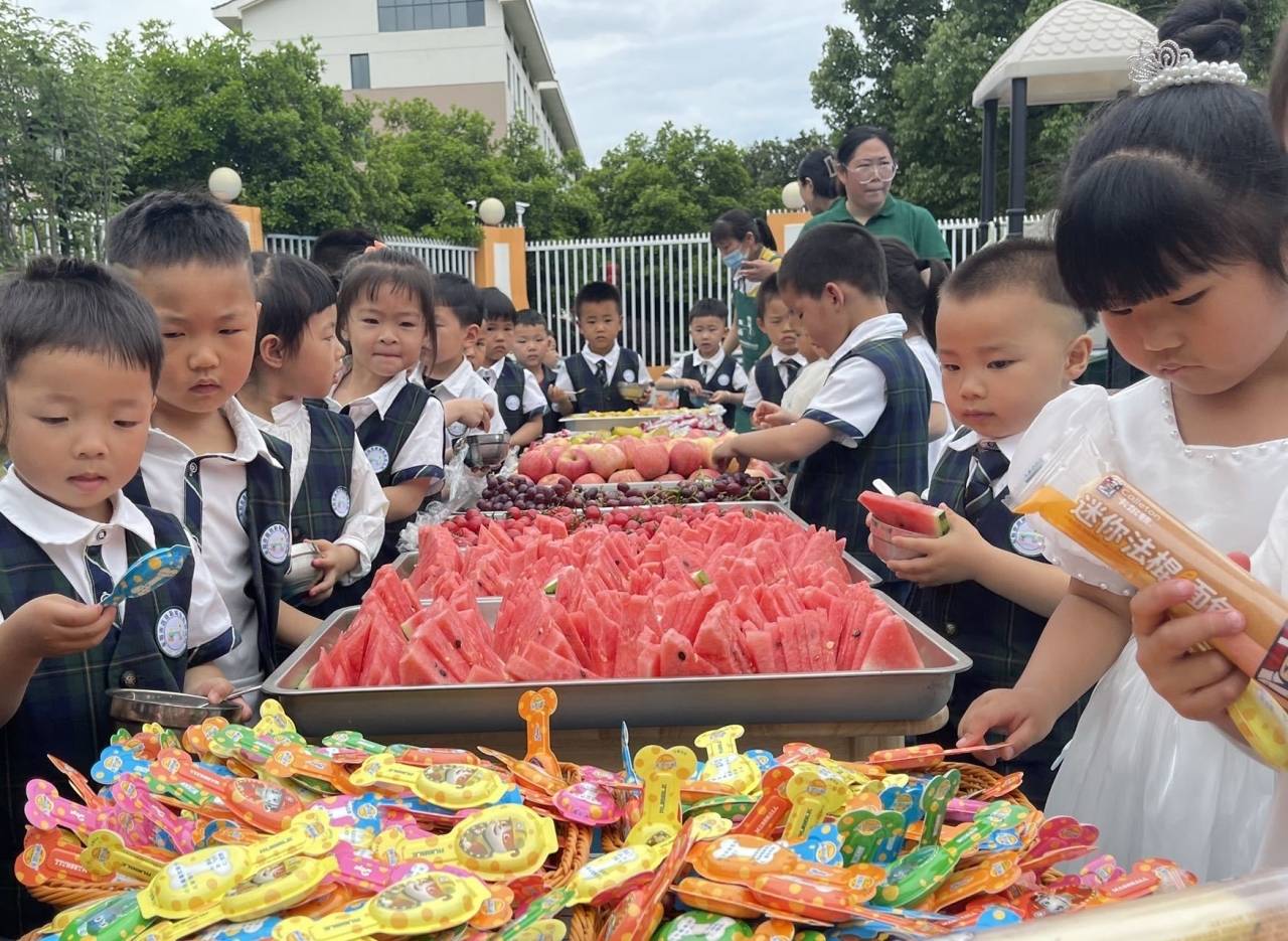 十一时,生日“家”宴准时开席。孩子们围坐在操场上的一张张桌子旁,桌子中间摆着孩子们亲手制作的传统美食。操场的一侧摆着一排长长的桌子,桌子上有西瓜、葡萄、苹果等水果,鸡翅、鸡腿、鸡排等肉制品,也有粉丝、蛋炒饭、玉米等主食,还有蛋挞、奶酪棒、面包等小甜品……美食种类十分丰富,供大家自主选取,孩子们兴奋极了。