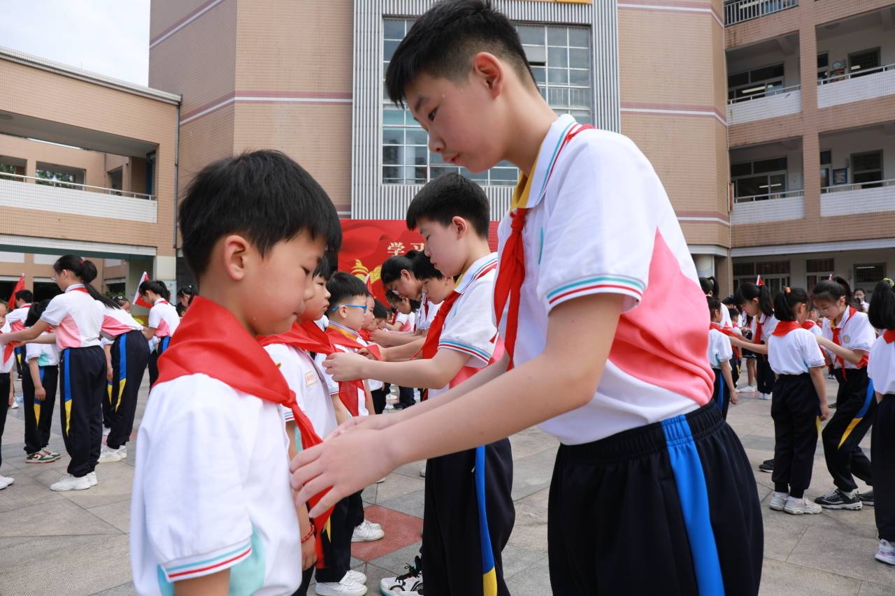 该校华山校区的小广场上,旗手们踏着整齐的步伐,精神抖擞地进行着庄严的出旗仪式,少先队入队仪式由此拉开帷幕。在雄壮的队歌声中,五年级的大哥哥大姐姐熟练地为108名朝气蓬勃的新队员佩戴上了红领巾;在大队辅导员包洁莹老师的带领下,孩子们高高举起稚嫩的拳头郑重宣誓;在大队长宗诗涵的提议下,队员们向敬爱的辅导员献上队礼表示感谢。
