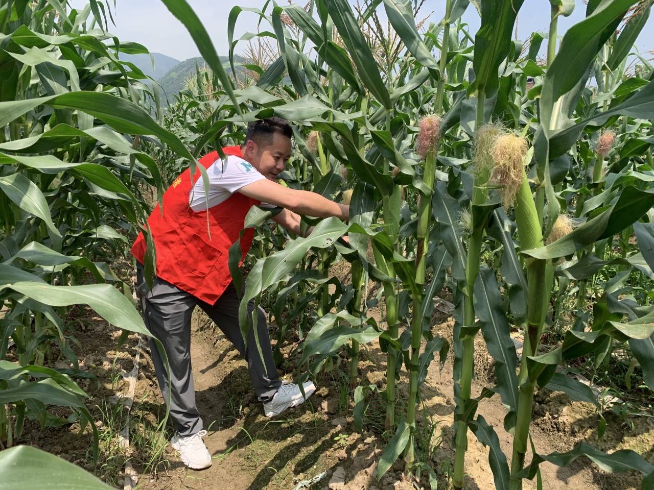 村干部在玉米“试验田”里帮忙采摘玉米