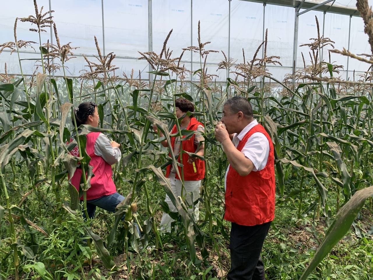 村干部在玉米“试验田”里采摘玉米后开心品尝