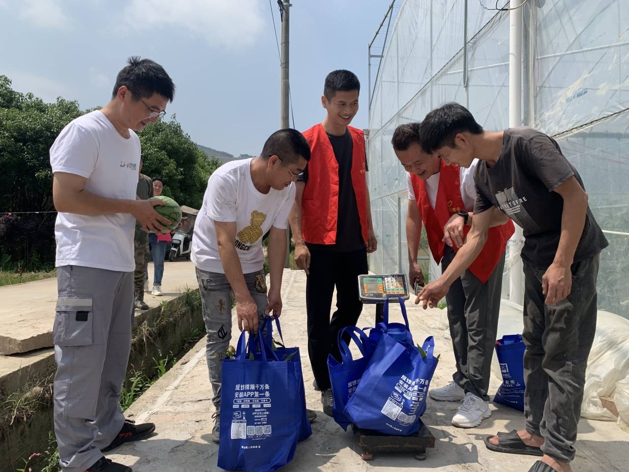 村干部与农户拿着装好的玉米过称