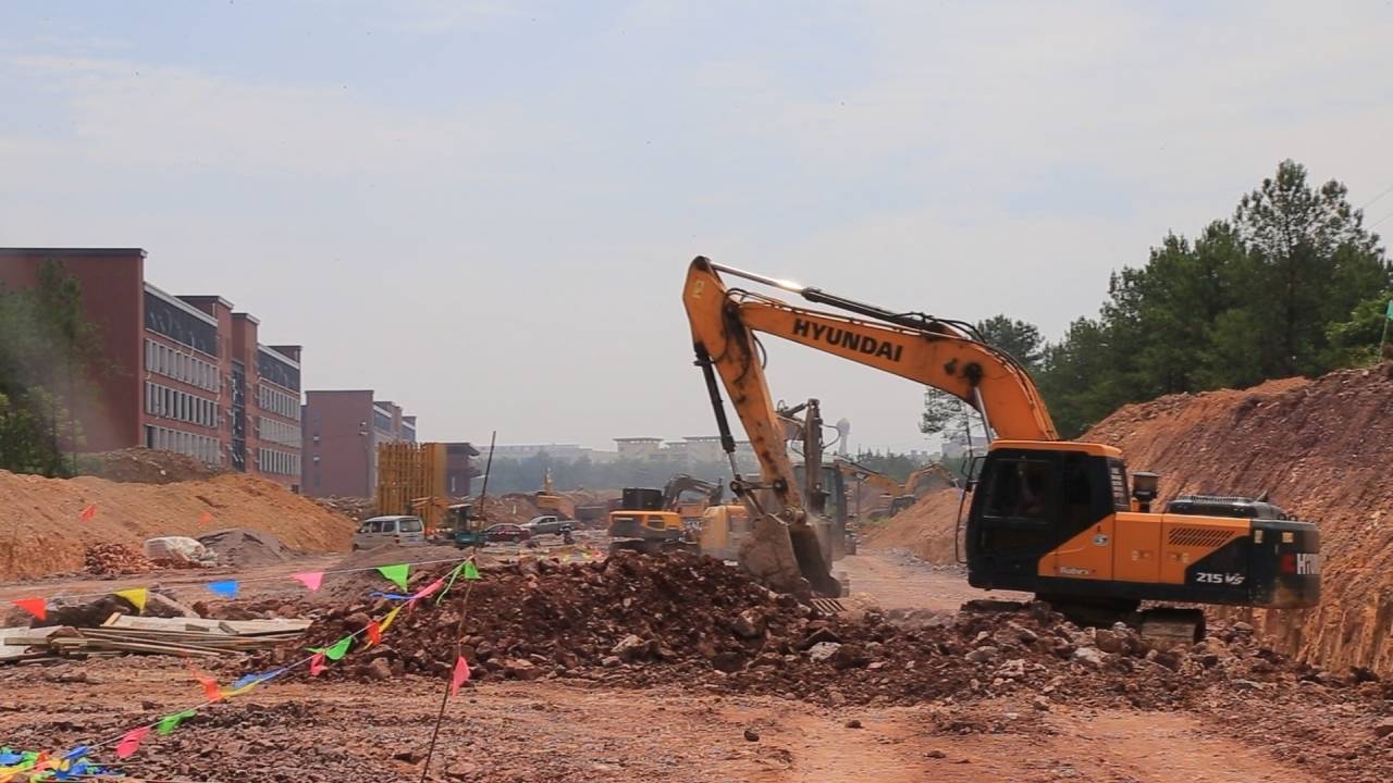 6月15日上午,在九鼎路延伸工程(永义公路-永康五金技师学院段)工地上,挖掘机、渣土车正在紧张作业,现场一派繁忙景象。