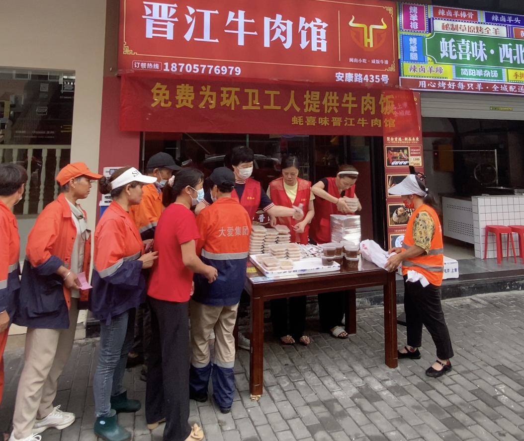 在事业有了起色之后,古雪丹做起了公益。从今年1月起,每个月的18日,她会带领员工为街道的200位环卫工人发放爱心早餐,送上自己店里做的牛肉羹和晋江咸饭,至今已开展7期。“我4年前就加入了中医院旁边的崇德慈爱站,知道他们有给环卫工人分发爱心包子的活动,刚好我们店里有肉有汤,就做了这样的公益。”她说。