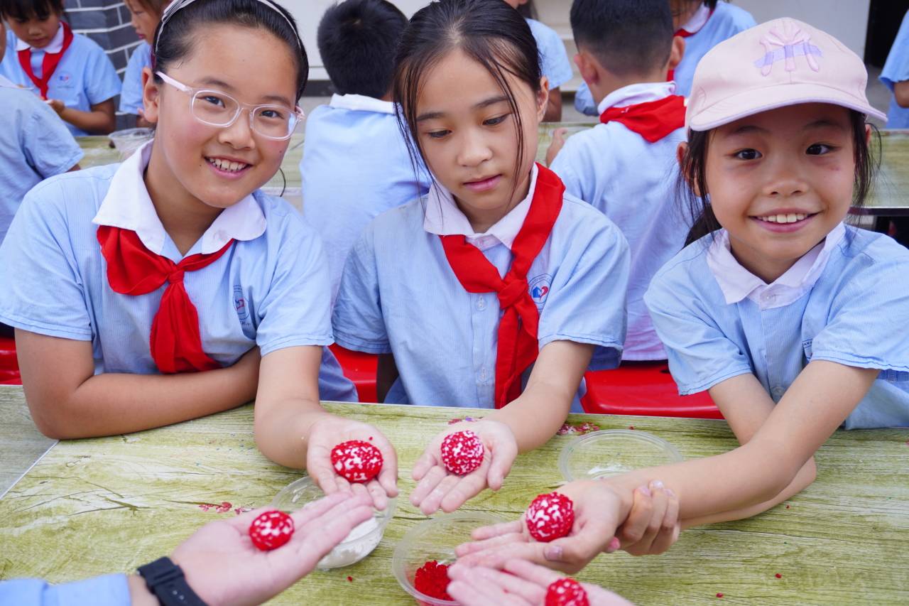 下午,同学们走进甘蔗林,亲自上手采收甘蔗,并将其榨成汁。辛苦劳作后大家嚼着甘蔗吮着汁,一个个喜笑颜开。随后,同学们又跟着教官学做东阳特色小吃杨梅粿。看着自己做的杨梅粿,同学们成就感满满。“老师,我想起课文《千人糕》里说,一块糕点需要很多人的参与才能制作完成。今天我们打的稻子可以加工成面粉,甘蔗汁可以熬成糖,经过许多劳动后,我们才能吃上香喷喷的杨梅粿……”三(1)班徐柔婷同学联系自己学过的课文开心地分享。