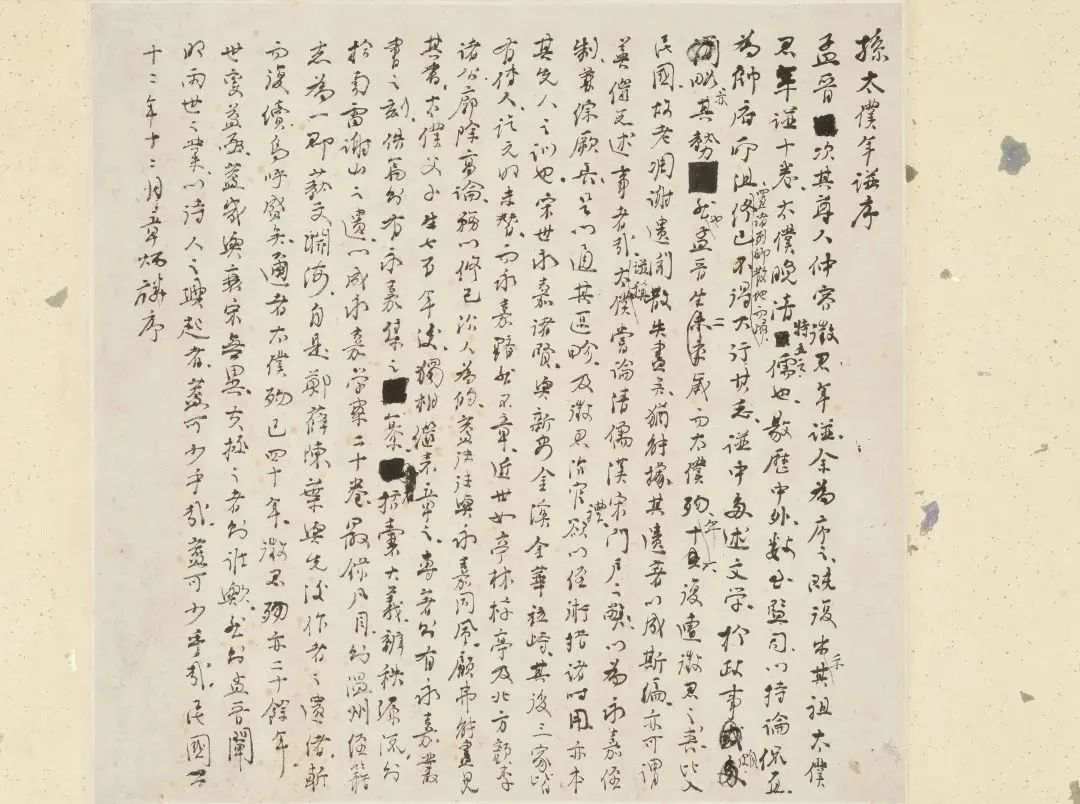 章炳麟(1869—1936),字枚叔,号太炎,浙江余杭人。近代著名学者、思想家、民主革命家。章炳麟的业师俞樾与孙衣言为道光三十年(1850)同科进士,后又同任职翰林院。章炳麟与孙诒让自中日甲午战后开始通信,二人均治经学、诸子学、文字学,在学术上多所探讨,互寄著作,虽一生未曾会面,但章炳麟对孙诒让的学术成就甚为钦服。这件手稿为章炳麟应孙延钊所请,为《孙诒让年谱》作序后,继为《孙衣言年谱》序,叙述了孙衣言搜集刊刻乡邦文献,复兴“永嘉学派”学说的事迹。
