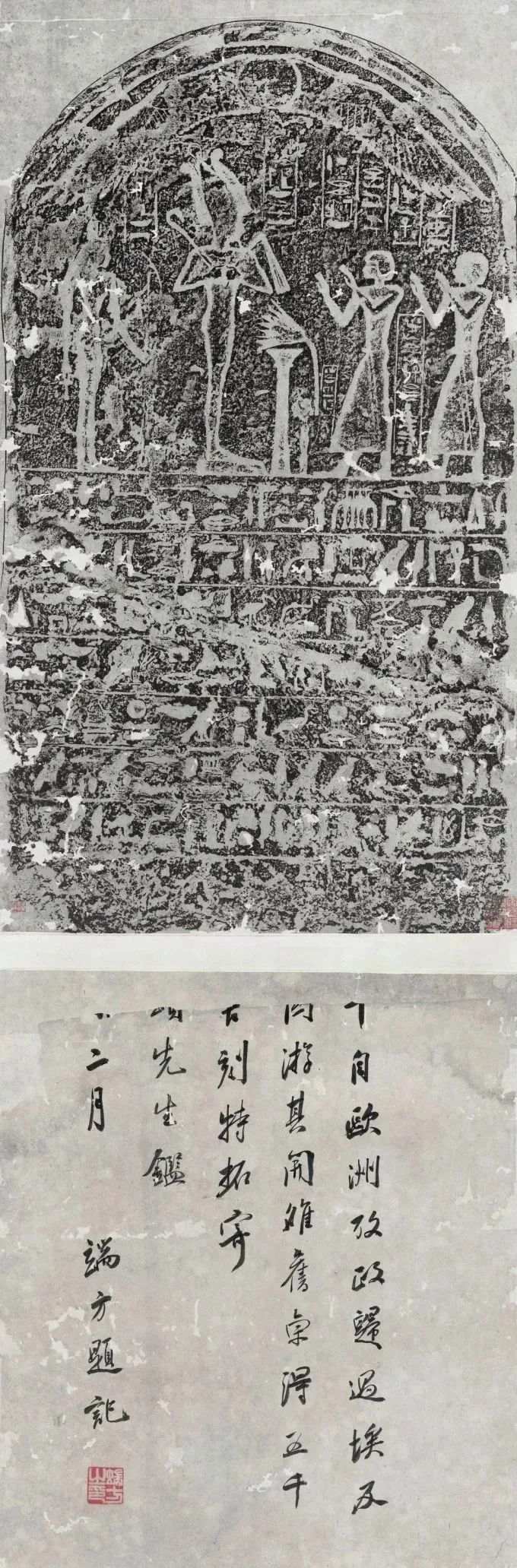 光绪三十一年(1905),清政府受立宪运动影响,派遣端方等五大臣出使西洋考察宪政。在返国途径埃及开罗时,端方曾购得一批古埃及造像石刻。回国后,椎拓题跋,分送友人。此即为光绪三十三年(1907)赠孙诒让的拓本。