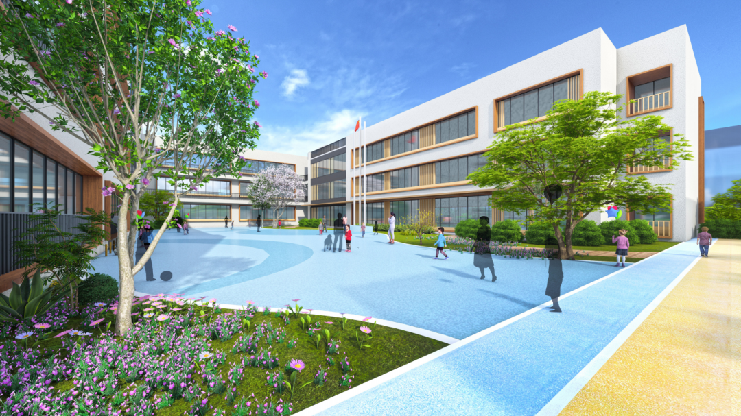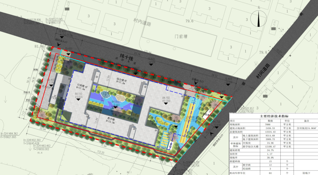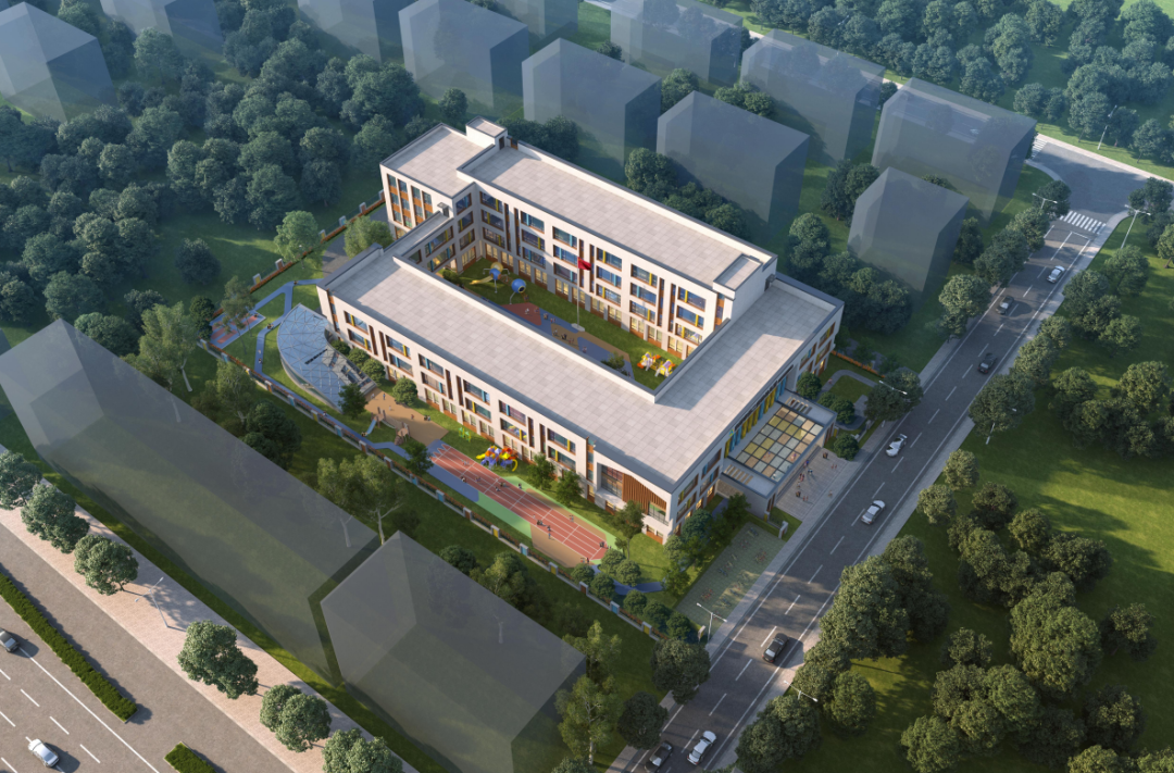 项目地块红线呈矩形分布,地块总用地面积约6640平方米(约9.96亩)。本次设计总共新增12个班,总建筑面积约11685.59平方米,地上建筑面积约7833.64平方米,地下建筑面积约3851.95平方米。
