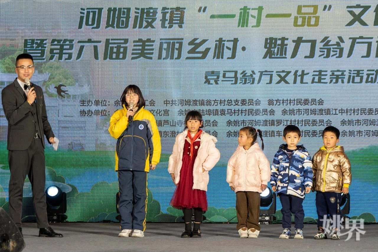12月29日,“文化先行 精神共富”河姆渡镇“一村一品”文化联姻活动暨第六届“美丽乡村 魅力翁方”迎新春文艺晚会袁马翁方文化走亲活动在翁方村举行。河姆渡镇党委副书记、镇长楼科挺、河姆渡镇党委委员鲁华、河姆渡镇副镇长陈楠、余姚市工人文化宫副主任宋坚玲、陆埠镇袁马村村委副主任马再军、河姆渡镇翁方村党总支书记宋泉军、河姆渡镇翁方村村委会副主任杨群、陆埠镇文化站负责人朱丹、河姆渡镇文化站负责人应彩珍等领导嘉宾参加活动。
