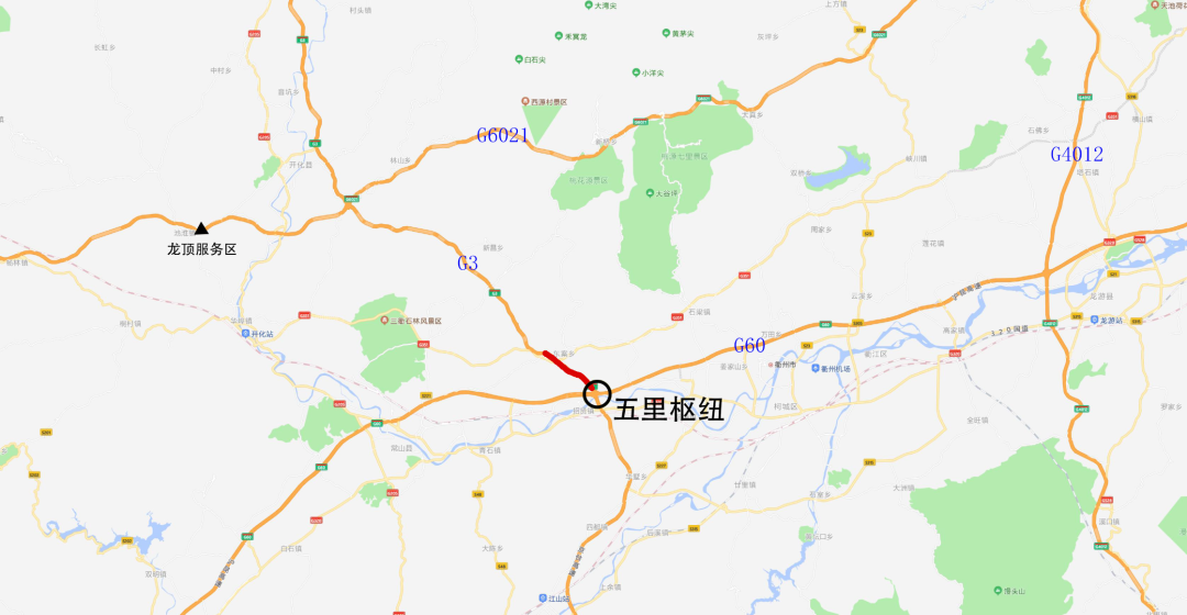 G6021杭长高速龙顶服务区、五里枢纽E匝道后方。