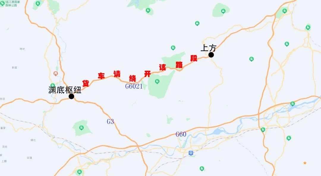 2、从江西前往杭州或上海的货车、危化品车,建议在渊底互通转G3高速,并在五里互通处再次转G60高速往杭州方向行驶。