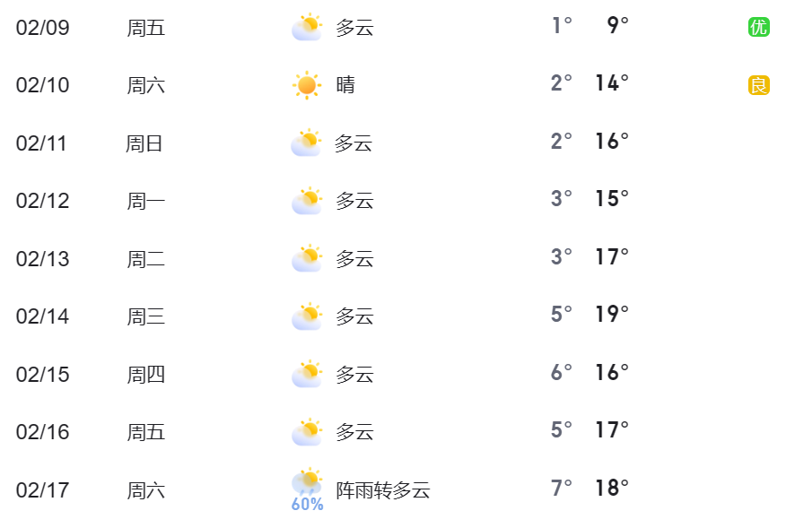 春节期间气温较稳定,以多云天气为主,提醒出行人员注意防寒保暖,开车出行前关注天气变化。
