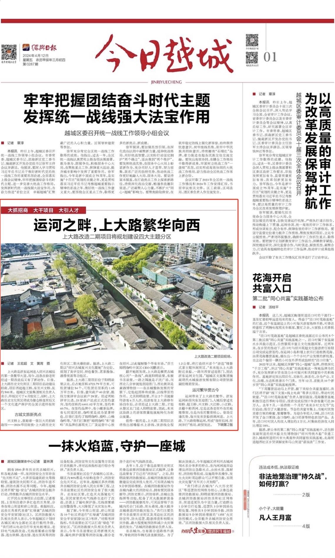兴文桥上,张贴着一张巨大的招商海报——2024华丽绽放·上大路历史文化街区二期火爆招商。据悉,上大路二期以“绍兴古城复兴文化潮地”为定位,规划了美学空间、特色餐饮、茗茶漫咖、酒香夜漾等功能区。
