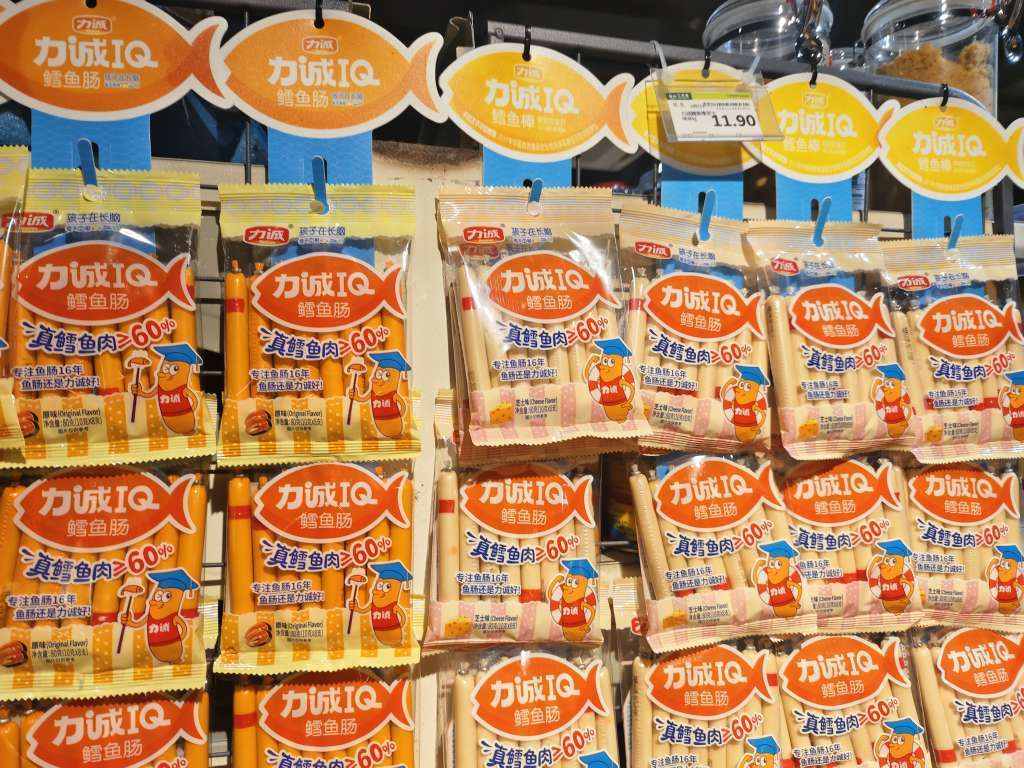 在昆阳镇一超市的食品区域货架上,几排迷你可爱的袋装香肠摆在醒目位置,没有特别标注为“儿童”食品,但是“孩子在长脑”的字样很是显眼,包装的中间位置印着“添加真鳕鱼肉”,翻看配料表,除了鳕鱼糜、白砂糖等外,还有食用香精、山梨酸钾、香辛料、DHA藻油等。该产品一包8支,总净含量为80克,售价11.9元。而普通火腿肠或者玉米肠,一包含量在300克到400克左右,售价为11.9元到13.9元。