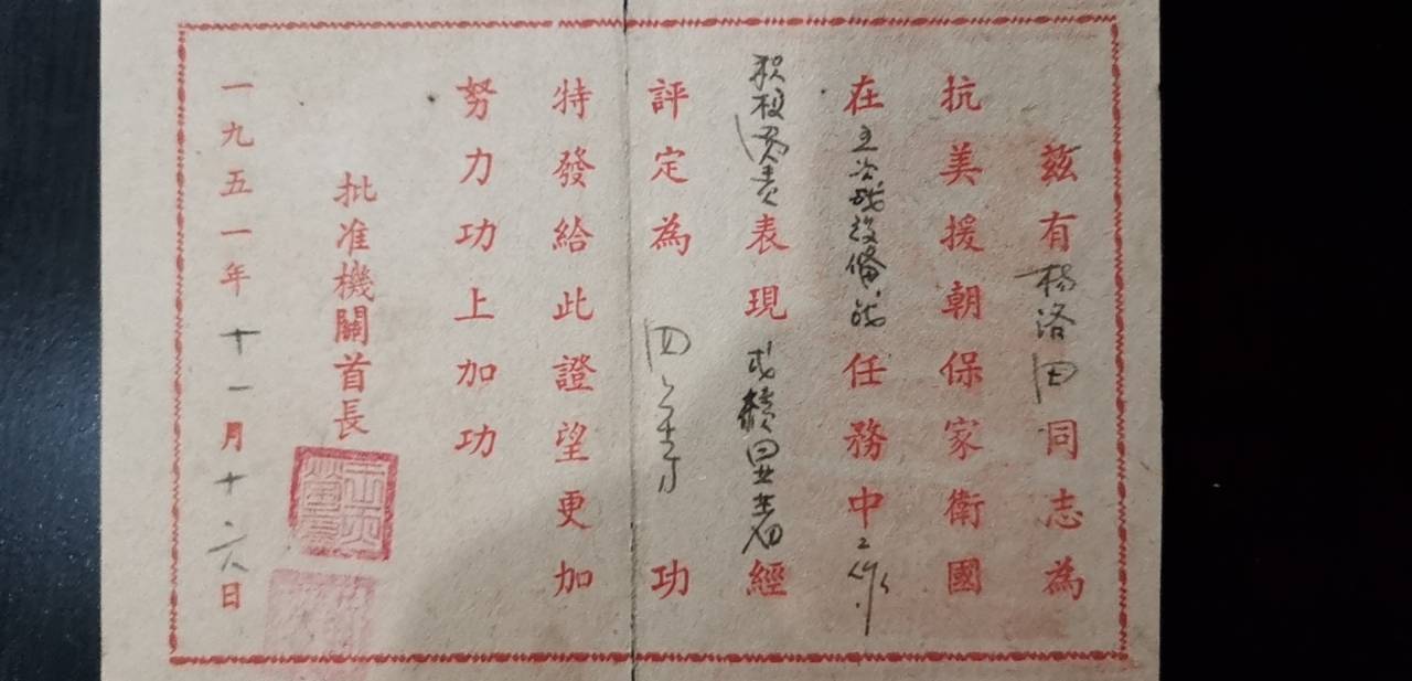 杨洛田“抗美援朝 保家卫国”四等功证书